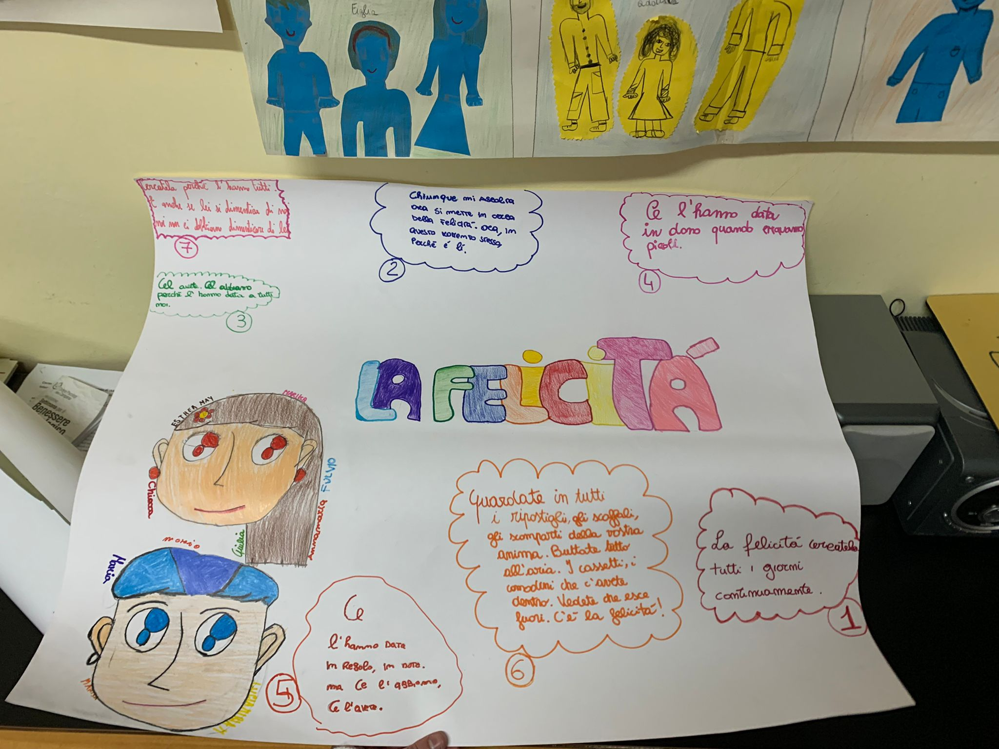 - La seconda è invece “Felicità chiama” : a partire dalla visione del video nel quale il celebre attore Roberto Benigni espone un monologo riguardante la felicità, ognuno scrive la frase che maggiormente gli è rimasta impressa, successivamente la legge e motiva la sua scelta riportandola su un cartellone per far si che diventi più indelebile che mai. Ciò attesta che, al contrario di come si potrebbe pensare, da alcuni “giochi” apparentemente insignificanti, si può arrivare a tanto. Si può arrivare addirittura a ricordare, in modo costruttivo, quelle cose che, spesso, sembrano sempre più distanti dall’immaginario collettivo e che, di conseguenza, tendono a dare origine ad uno stato di angoscia che non permette di scorgere i lati positivi della vita.