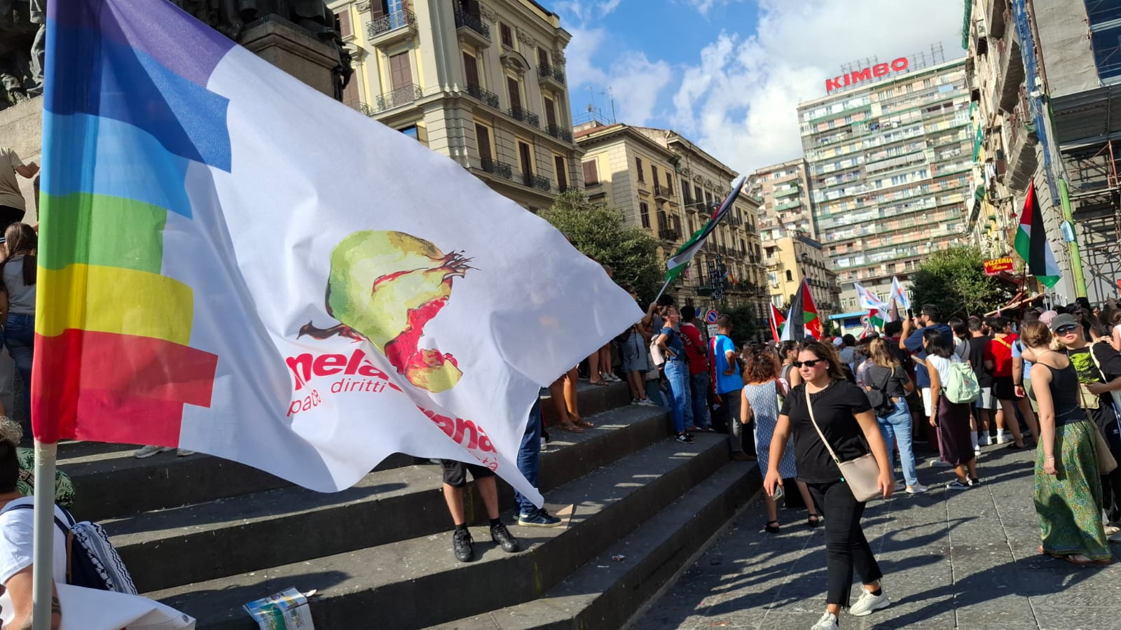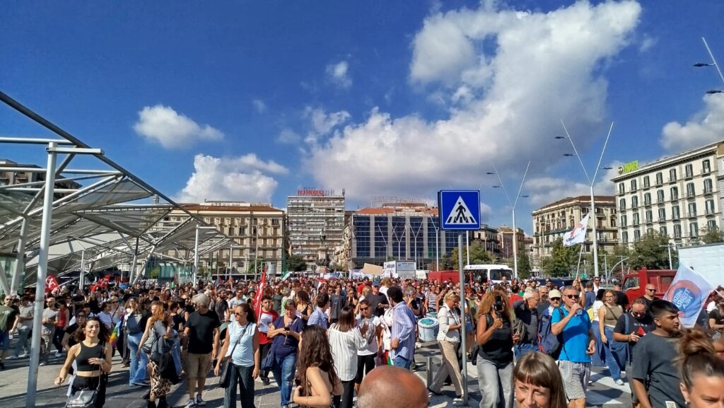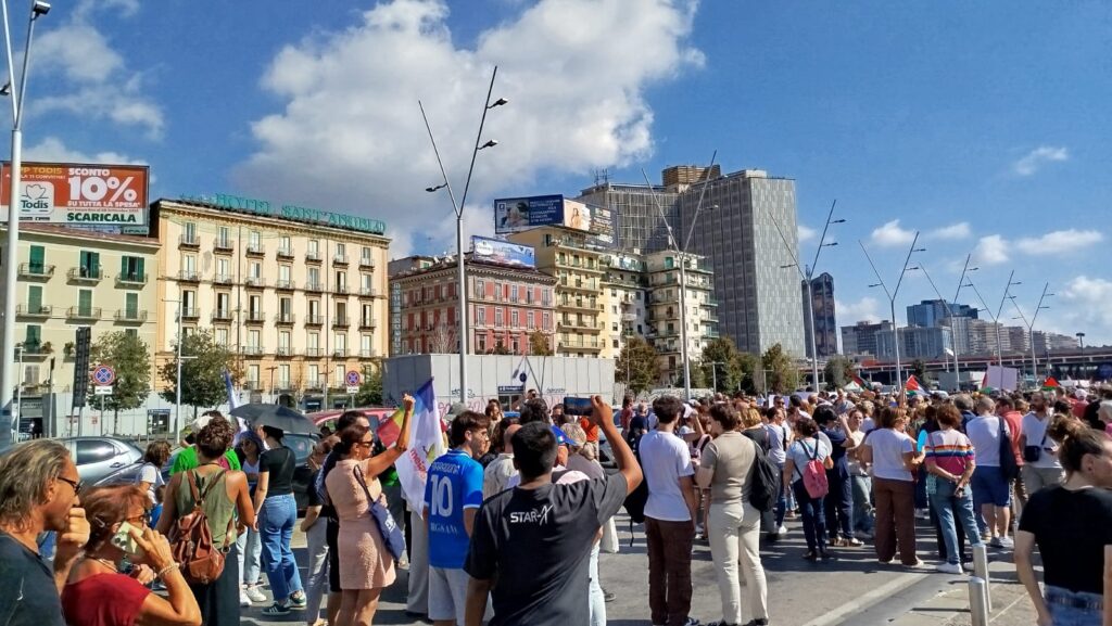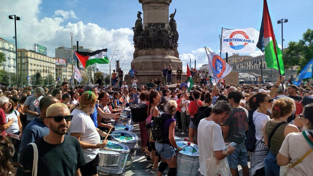 Una manifestazione così partecipata, non la si vedeva da parecchio. Migliaia di persone provenienti da tutta la Campania, hanno riempito piazza Garibaldi, in un turbinio di colori, bandiere, striscioni e slogan. Lo sciopero di oggi, indetto dall’USB (Unione Sindacale di Base), per dire Stop al Genocidio, per dire stop alla sofferenza del popolo palestinese, e per fare pressione sul governo italiano affinchè dismetta i panni del supporter incondizionato di Netanyahu e si accodi al coro di quegli stati che riconoscono la Palestina e si impegnano a promuoverla. All’appello hanno risposto in migliaia: partiti, associazioni, sindacati, associazioni di categoria, studenti e precari, comunità palestinese e anche noi di Melagrana.